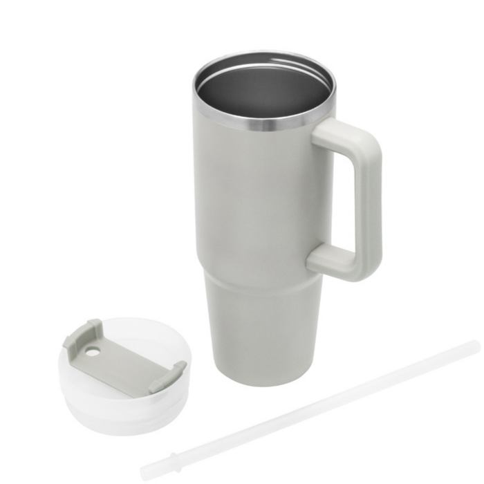 Mug doble pared, sellado al vacío con sorbete. Tecnología Vacuum. Interior en acero 304 y exterior en acero 201. Tapa plástica transparente a rosca con anillo de silicona. Cierre giratorio porta sorbete. Sorbete plástico translucido. Pintura exterior con acabado mate. Mantiene hasta 12 hs la temperatura de las bebidas calientes y 24 hs de las bebidas frías. Presentación en caja de regalo kraft. Capacidad 880 ml. Acero inoxidable y PP.