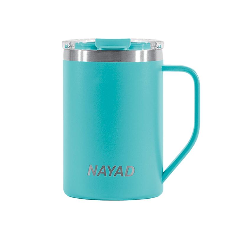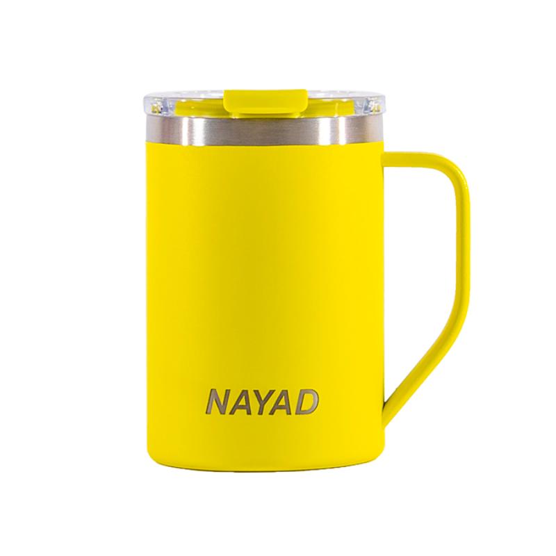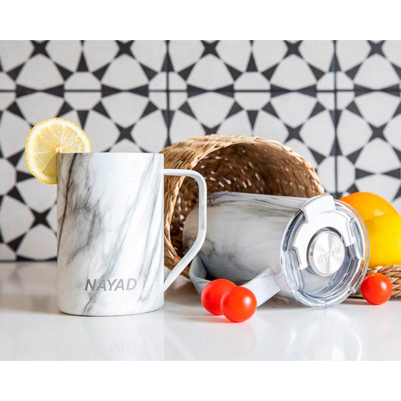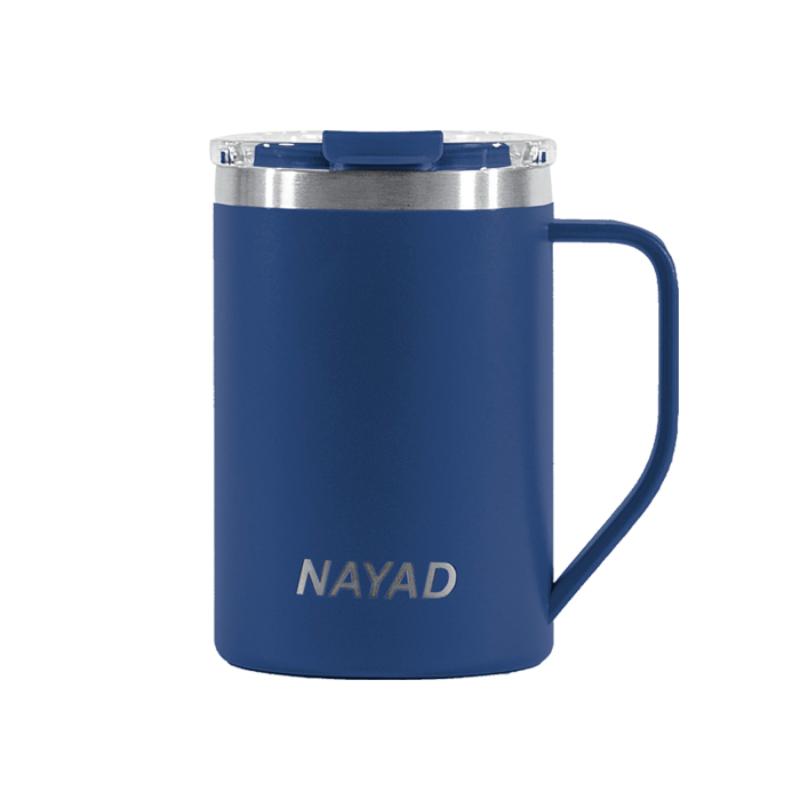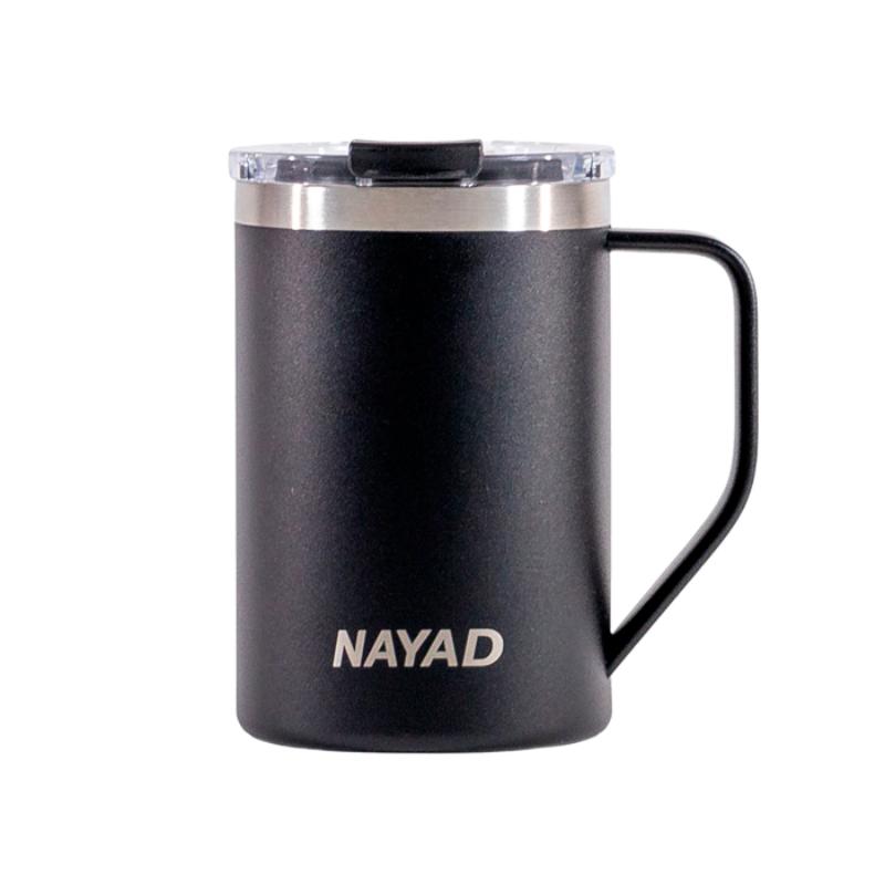 Termo de acero inoxidable 304 de doble pared marca NAYAD insulado al alto vacío, cuenta con capa interior de cobre que permite mantener las bebidas frías por 20 hrs. y calientes por 10 hrs. Tiene acabado de polvo plástico, asa ergonómica para un agarre más firme. Incluye tapa de tritan con cierre a presión, detalle metálico en el centro y tapón abatible que permite beber fácilmente. CAP. 440 ml. (15 OZ). Presentación: Caja de color.