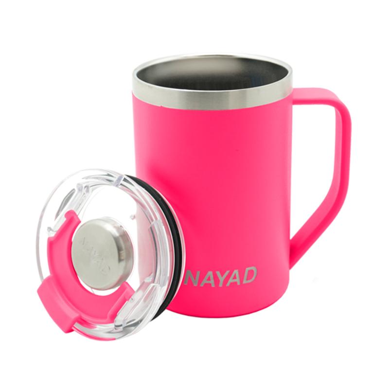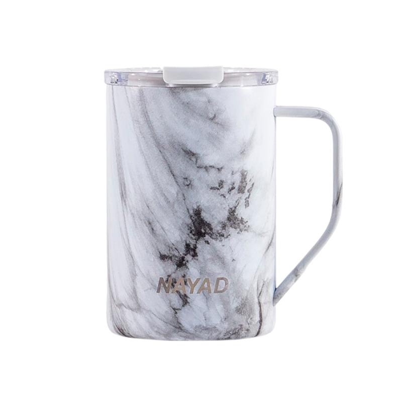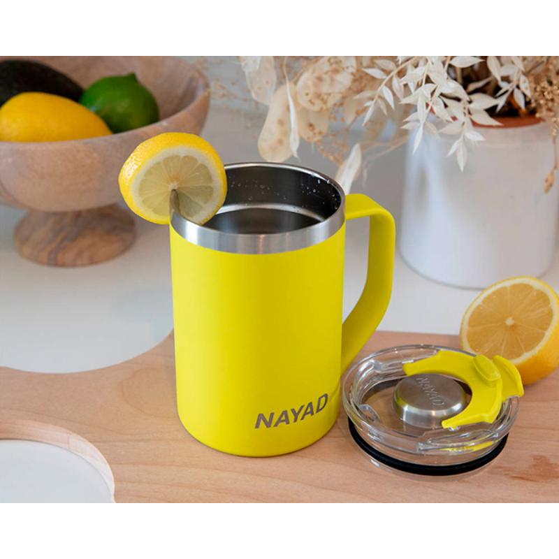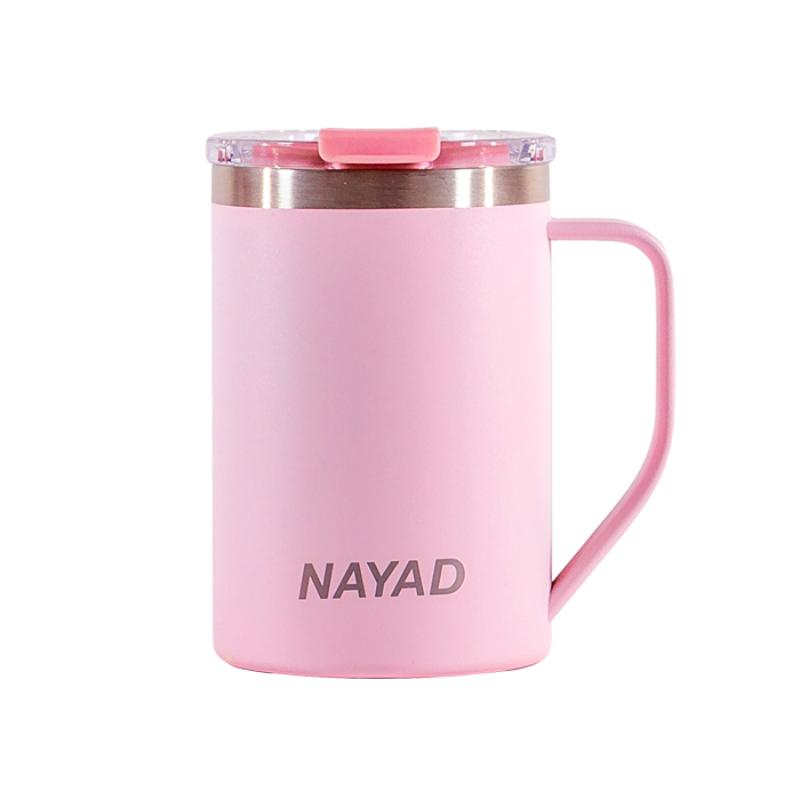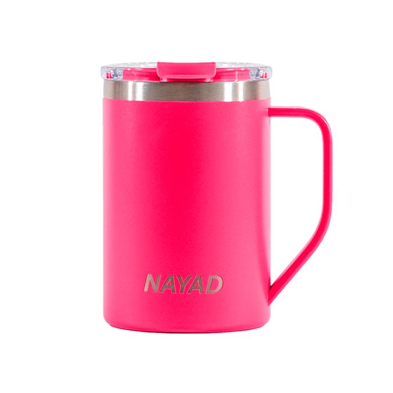 Termo de acero inoxidable 304 de doble pared marca NAYAD insulado al alto vacío, cuenta con capa interior de cobre que permite mantener las bebidas frías por 20 hrs. y calientes por 10 hrs. Tiene acabado de polvo plástico, asa ergonómica para un agarre más firme. Incluye tapa de tritan con cierre a presión, detalle metálico en el centro y tapón abatible que permite beber fácilmente. CAP. 440 ml. (15 OZ). Presentación: Caja de color.