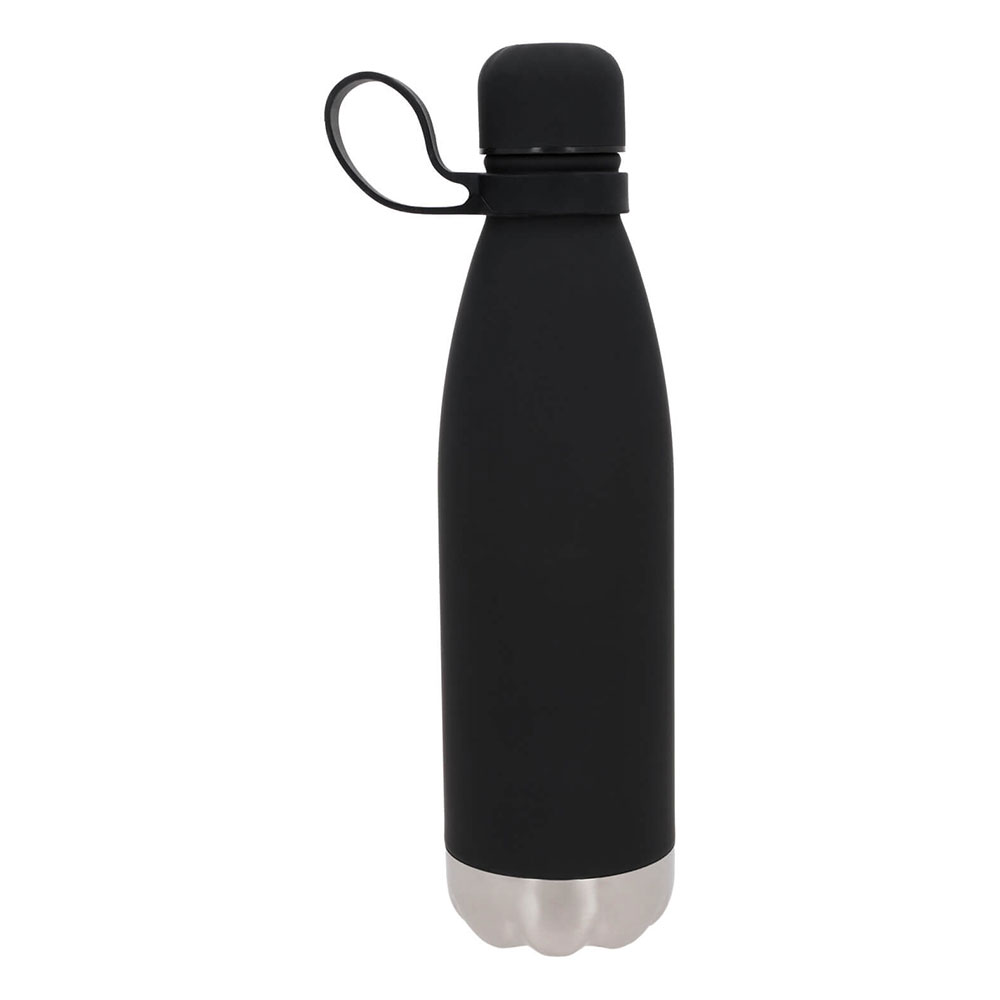 Termo con doble pared de acero inoxidable, insulado al vacío, acabado rubber, tapa enroscable y asa de silicón.