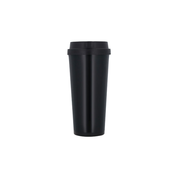 Termo de plástico con doble pared y tapa enroscable con seguro deslizable.