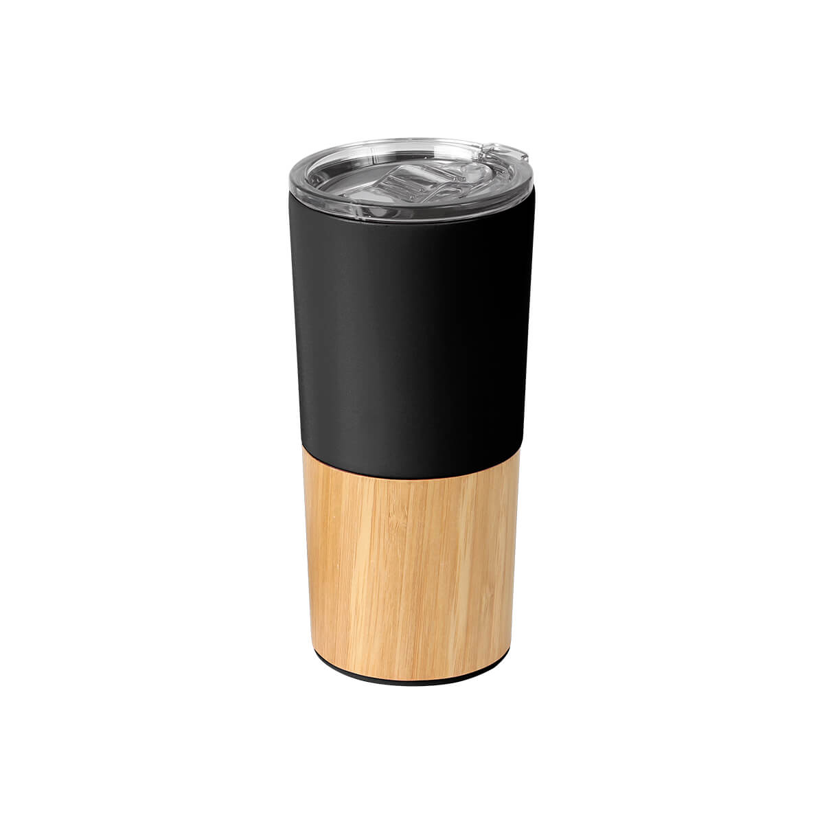 Termo de acero inoxidable doble pared con detalle en bambú, tapa plástica deslizable, fabricado en materiales de grado alimenticio, mantiene bebidas frías o calientes por un largo tiempo. No usar en microondas. Capacidad de 600 ml. Incluye caja de cartón individual.