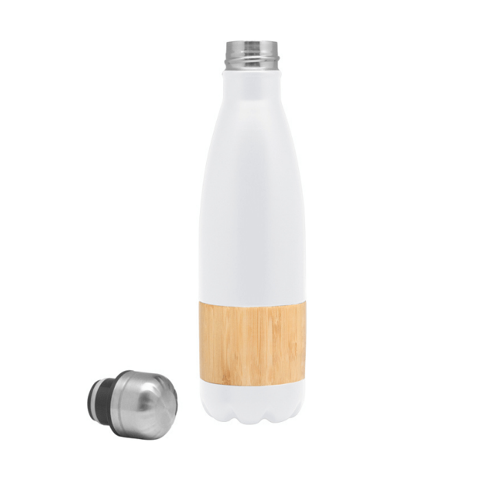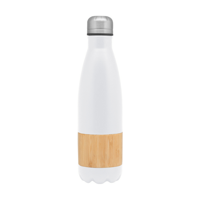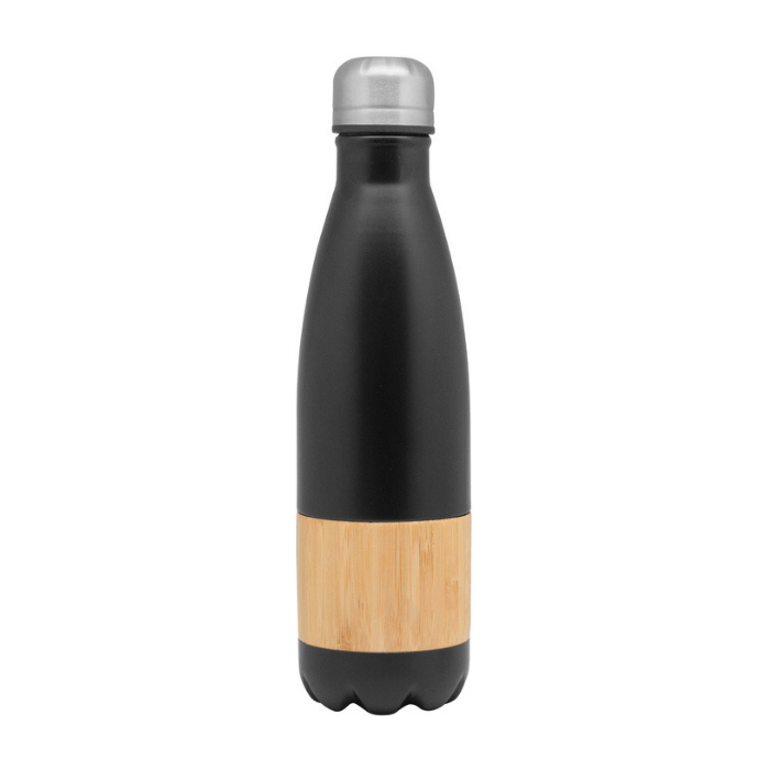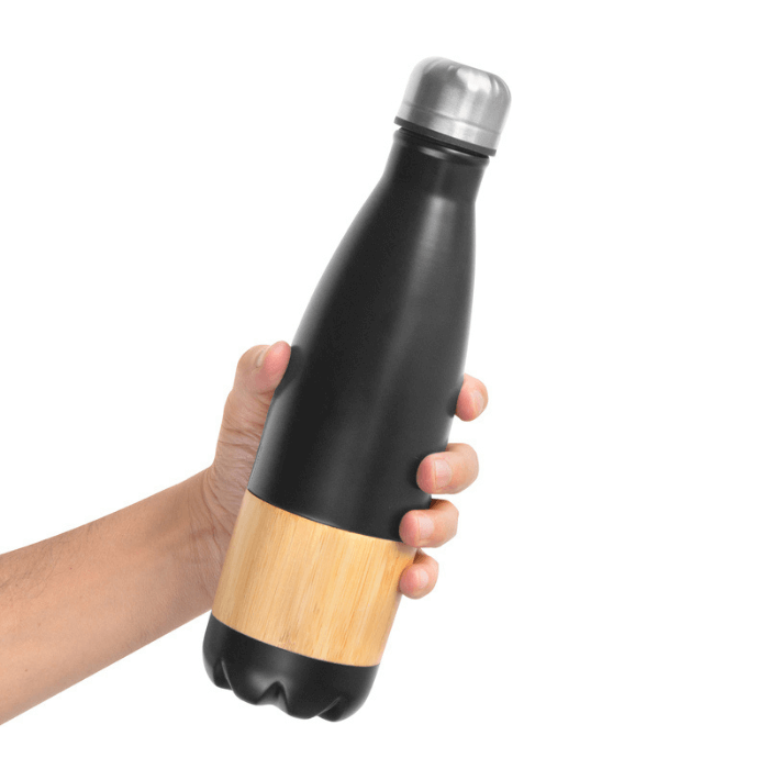 Botella doble pared, sellada al vacío. Interior en acero 304 y exterior en acero 201, con detalles de Bambú. Tapa de acero. Mantiene hasta 12 hs la temperatura de las bebidas calientes y 24 hs de las bebidas frías. Presentación en caja de regalo Kraft. Capacidad 500 ml. Acero inoxidable.
