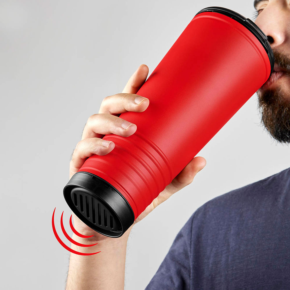 ¡Lleva la emoción de los eventos deportivos al siguiente nivel! Termo equipado con una boquilla especial en la tapa que realiza una doble función; como trompeta, para animar tu evento favorito y al mismo tiempo, disfrutar de tu bebida preferida. Termo doble pared. Pared interna de plástico y externa de acero inoxidable. Tapa de plástico con sistema push y válvula de seguridad. Capacidad de 24 Oz. Base de 7 cm de diámetro. Incluye caja individual.