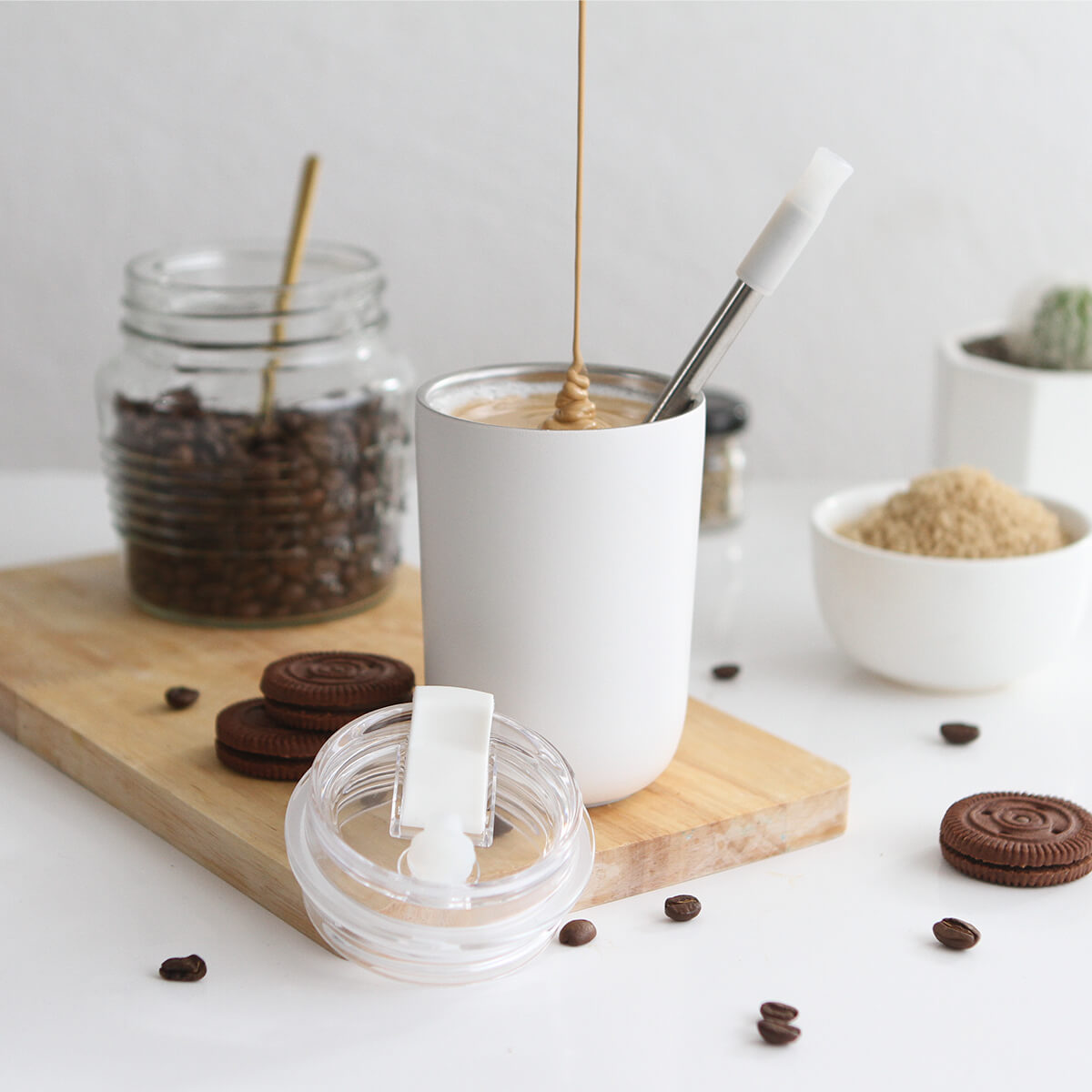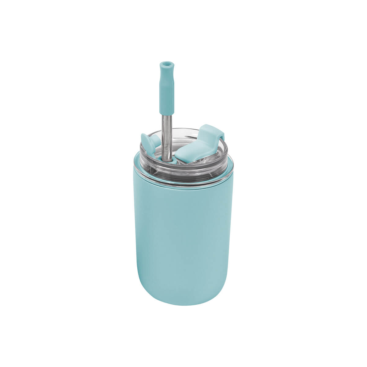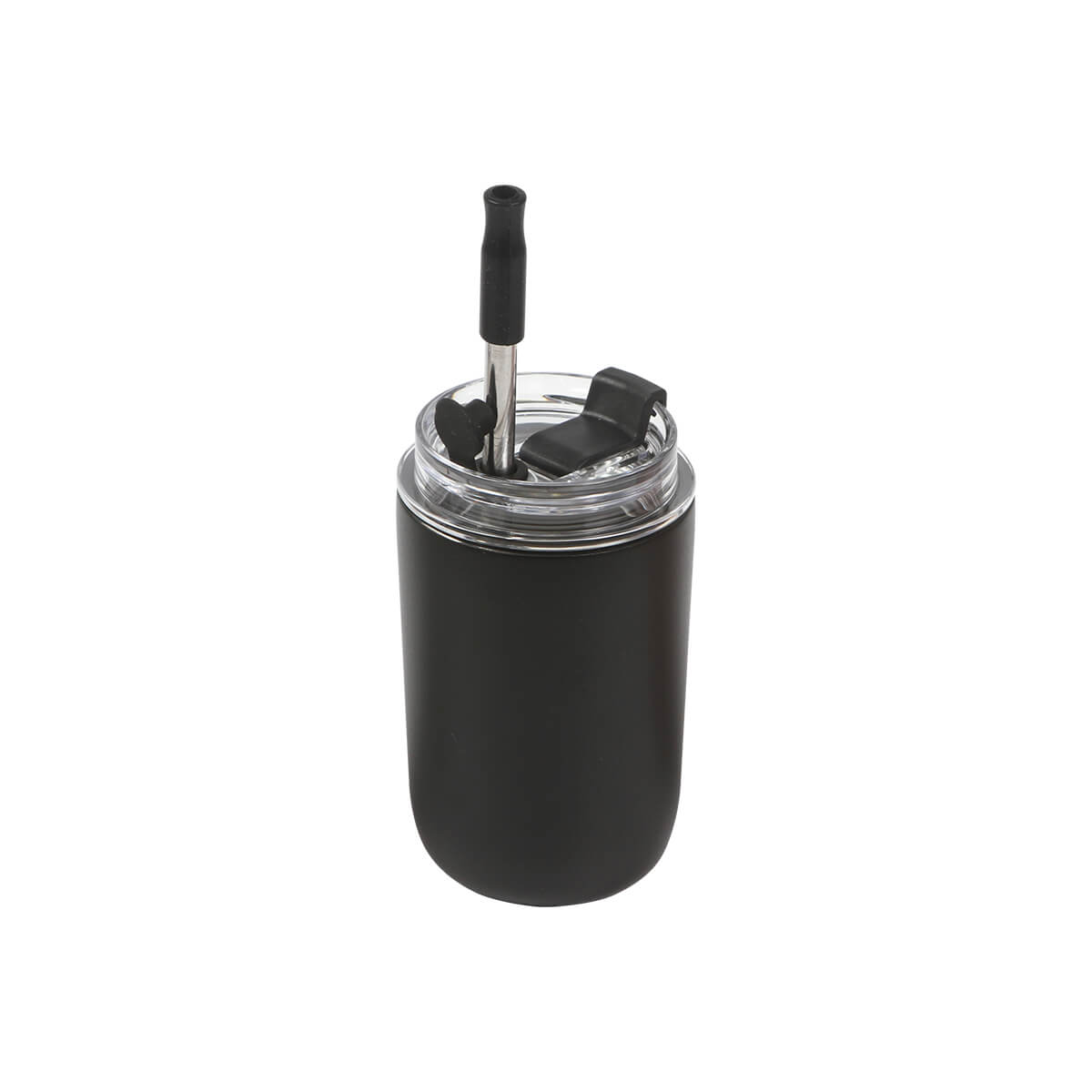 Vaso de acero inoxidable doble pared con tapa de plástico deslizable y popote de metal con detalle de silicón en la parte superior. Fabricado en materiales de grado alimenticio, mantiene bebidas frías o calientes por un largo tiempo. No usar en microondas. Capacidad 300 ml. Incluye caja de cartón individual.