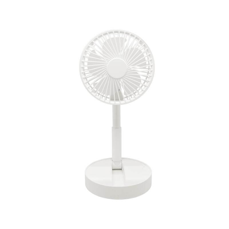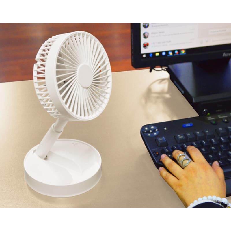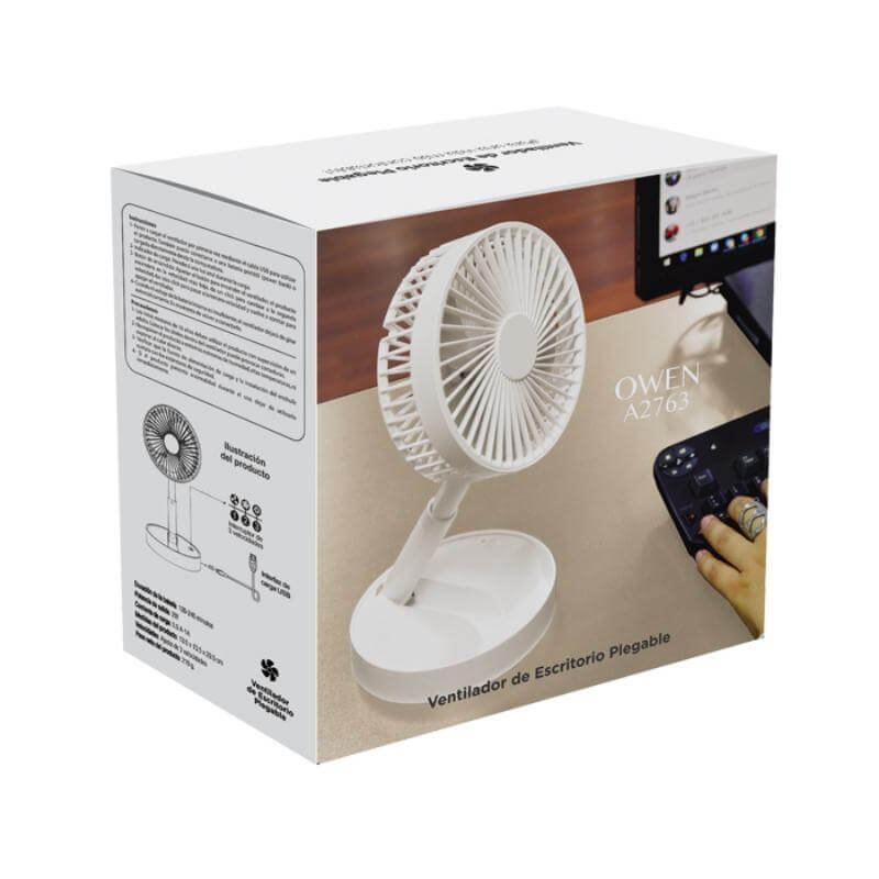 Ventilador plegable ideal para interior o exterior. Cuenta con botón de encendido, presiona el botón y cambia la velocidad del aire en 3 diferentes intensidades. Cuerpo plegable que permite el movimiento del ventilador para ajustar la dirección del aire. Recarga mediante conexión USB, es plegable y ligero para que puedas llevarlo o guardarlo fácilmente. Incluye cable de carga. Presentación: caja de regalo a color.