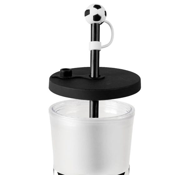Vaso doble pared de plástico. Acabado frosty suave al tacto y tapa de rosca. Cuenta con popote de plástico reutilizable y tapón de silicón en forma de balón.
